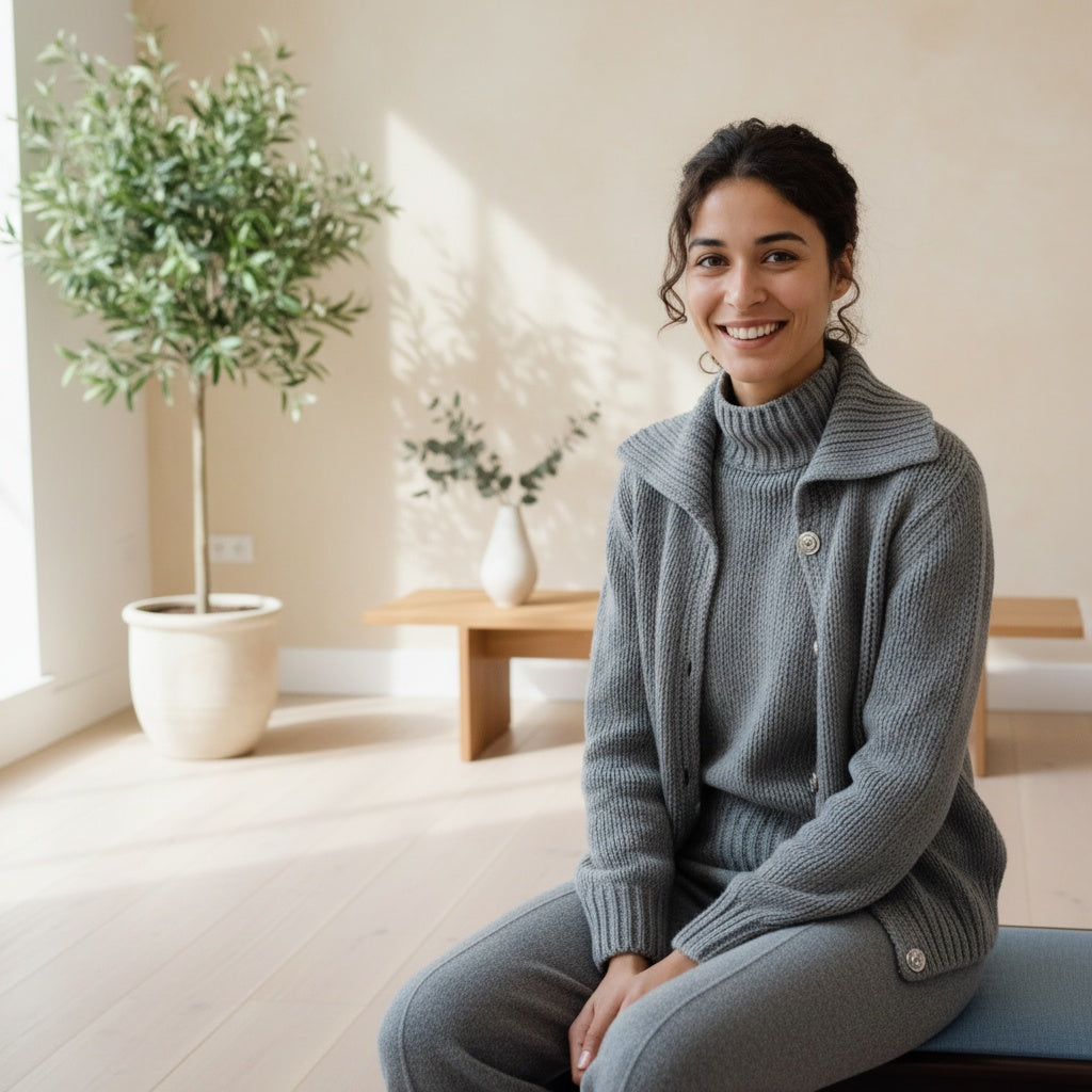 Dieser Grobstrick Cardigan aus einer hochwertigen Kaschmirmischung für Damen verbindet eine markante Struktur mit einem weichen, angenehmen Tragegefühl. Die feine Mischung aus Kaschmir und Wolle schafft natürliche Wärme und eine geschmeidige Textur, die sanft auf der Haut liegt und zugleich ein bewusstes, ruhiges Statement setzt. Die grobe Strickstruktur verleiht dem Modell Tiefe und lässt die ruhige Silhouette gleichzeitig lässig und elegant wirken, sodass es sich mühelos in nachhaltige Damenmode einfügt. Durch die reduzierte Form entsteht ein vielseitig kombinierbarer Begleiter, der mit feinen Hosen oder minimalistischen Kleidern harmoniert und sich in Premium Basics integrieren lässt. Als Teil von Slow Fashion steht dieser Cardigan für langlebige Wollkleidung, die Komfort, Ruhe und zeitlose Ästhetik vereint.